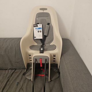 Asiento infantil para bicicleta de Decathlon. - Color beige y gris. - Incluye cinturón de seguridad. - Diseño ergonómico.