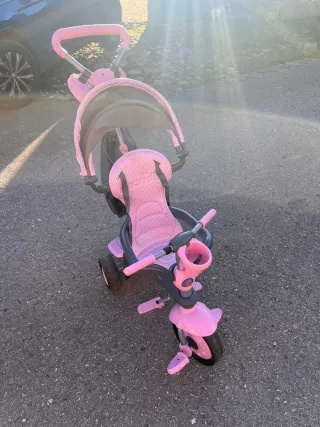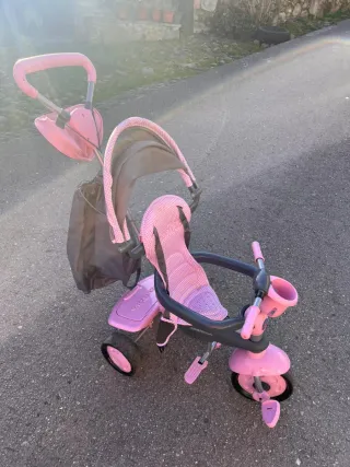 Triciclo infantil de color rosa, ideal para los más pequeños. Cuenta con un diseño pensado para la comodidad y seguridad. - Asiento acolchado. - Capota protectora. - Barra de empuje. - Reposapiés.