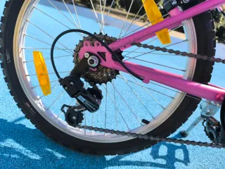 Bicicleta infantil de 20 pulgadas, ideal para los más pequeños. Cuenta con 6 velocidades para adaptarse a diferentes terrenos. - Color rosa vibrante. - Ruedas de 20 pulgadas. - 6 velocidades. - Pata metálica - Soporte para Bebida