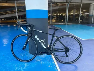 Bicicleta de carretera B'TWIN en color negro con detalles blancos. Ideal para iniciarse en el ciclismo. - Cuadro de aluminio. - Ruedas de 700c. - Manillar de carretera.