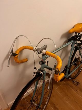 Bicicleta de carretera clásica de la marca Rabasa Derbi, modelo Corsa. Un diseño icónico para los amantes del ciclismo vintage. Se regala luz delantera. - Cuadro de color azul claro. - Sillín de color amarillo. - Cableado frenos nuevo - Manillar con cinta de color amarillo. - Talla S