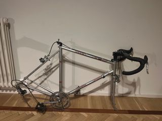 Cuadro de bicicleta clásica de la marca BH. Ideal para proyectos de restauración o para quienes buscan un estilo retro. Además incluye pedales, frenos shimano nuevos y manillar de carbono con potencia. También incluye sillín. - Material: Aluminio - Color: Plateado - Diseño vintage
