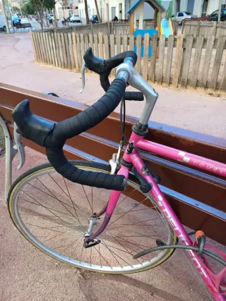 Bicicleta de carretera Peugeot de color granate. Un modelo clásico con detalles deportivos. - Cuadro de acero. - Manillar de carretera. Con una puesta a punto esta perfecta. Le he ido haciendo mantenimientos. Por un problema personal deje de usarla y por eso la vendo. Hay q cambiarle las ruedas.
