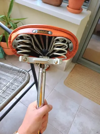 Asiento de bicicleta Mobylette retro vintage, en color naranja y con un diseño clásico tanto para una bicicleta restaurada como para antiguo ciclomotor o motocicleta - Tapizado en naranja. - Resortes metálicos para mayor comodidad. - Detalles de la marca Mobylette. Asiento superviviente en muy buen estado oportunidad. Tags: Raleight Brompton bh vespa vespuno gimson emporiun manillar llanta cubierta cuadro fixi fixie bici moto gac vitus campagnolo unico restauración exclusivo taller lampara industrial