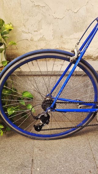 Bicicleta de carretera clásica italiana, con un llamativo color azul, se nota la robusted de sus componentes, fabricacion de calidad de la epoca, tiene los cambios incorporados en la palanca de freno, divertida de conducir y solida, lleva tiempo parada por lo que necesita puesta a punto, se le cambiaron los pedales automaticos por unos normales, estas bicicletas ya no se hacen, talla M - Cuadro metalico. - Manillar con cinta rosa. - Ruedas MAVIC. - Sillín negro.