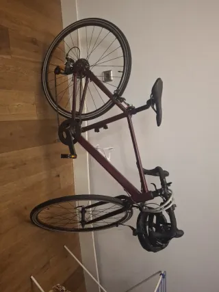 Venta por mudanza, incluye los accesorios de la foto, usada máximo 10 veces. Bicicleta de carretera Decathlon en color borgoña. Descripción Detalles del diseño Para altura 1,50 m - 1,64 m: Talla XS Cuadro de aluminio 6061 sloping con juego de dirección. Sistema de frenado doble: Palancas de freno ciclocrós Tektro RL 576 sobre el manillar Palancas clásicas de carretera adaptadas a las manos pequeñas Microshift SB-R480S Manillar/potencia/dirección Manillar de aluminio B'TWIN SPORT Ancho del manillar eje-eje: 400 mm