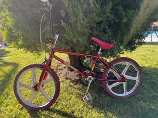 Bicicleta BMX Montana de estilo retro, fabricada en los años 80. Un clásico para coleccionistas y amantes del BMX. - Cuadro de color rojo brillante. - Ruedas de 5 radios blancas. - Neumáticos de color rojo. - Sillín rojo. - Manillar cromado.