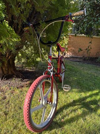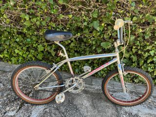 Clásica bicicleta BMX Monty 129 del año 1986. Un modelo icónico para los amantes del BMX y coleccionistas. - Cuadro de acero cromado. - Llantas rojas, neumáticos de flanco marrón y pedales blancos de época originales. - Ruedas de 20 pulgadas. - Manillar cromado. - Sillín negro. En buen estado