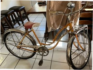 Bicicleta clásica de estilo vintage con un llamativo color naranja y detalles cromados. - Cuadro curvo distintivo. - Sillín rojo y blanco. - Guardabarros delanteros y traseros cromados. - Ruedas de radios. - Manillar curvo con puños de época.