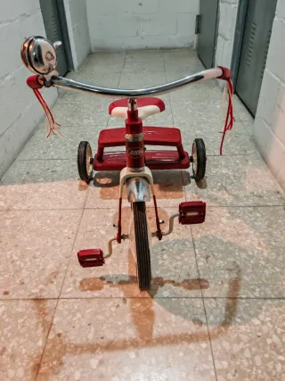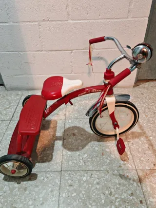 Usado pero muy bien conservado. Clásico triciclo infantil de la marca Radio Flyer. Recojida en mano pq el envio no seria posible ya q saldria muy caro. Es muy bonito y esta bien conservado. - Color rojo brillante. - Asiento ergonómico. - Manillar cromado con puños rojos. - Campana plateada. - Ruedas con detalles blancos.