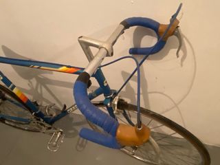 Bicicleta Orbea clásica en color azul, un modelo original de época.Todos los accesorios son originales y la bicicleta funciona Talla L - Cuadro de metal. - Ruedas de radios. - Sillín blanco. - Manillar curvo con puños azules y marrones.