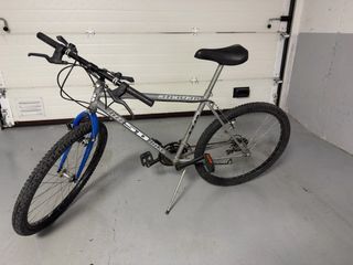 Bicicleta de montaña plateada con detalles en azul. - Ruedas todoterreno. En buen estado - Sillín negro. - Manillar negro - 18 marchas - Llanta de 26” - Se vende por poco uso