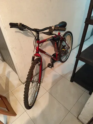 Bicicleta de montaña de color rojo, ideal para disfrutar de rutas y caminos.Hay que mirar ruedas, x el resto funciona. - Cuadro de metal. - Ruedas todoterreno. - Manillar curvo.