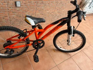 Bicicleta de montaña Monty con ruedas de 20 pulgadas. En perfectas condiciones. - Cuadro de aluminio - color naranja y negro. - Sillín con detalles en blanco y amarillo. - Manillar con puños negros. -Suspensión delantera. - Frenos delanteros y traseros. - Cambio 6 velocidades.