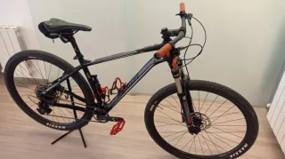 Bicicleta de montaña KTM en color naranja. La acabo de rebajar 300 euros - Cuadro de carbono. - Horquilla RockShox. KTM Myroon Ltd.Es una MTB con cuadro de carbono, transmisión Shimano Kt. Frenos de disco Xt y manillar y tija Ritchey, de aluminio, Ilantas DT Suiss, de aluminio, con 275" de diametro. Neumaticos tubelizados y con sellante Es una talla S, de 17". Para personas de entre 1'55 y 175 cm de altura. Está muy nueva, a toda prueba