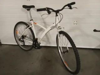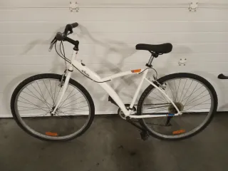 Bicicleta de paseo Btwin en color blanco. Ideal para paseos y desplazamientos. Bicicleta con llantas de aluminio de 700, neumáticos mixtos en buen estado para hacer ciudad y caminos, barra baja, manillar de doble altura, cambio de marchas, frenos V-Brake, monoplato con protector del plato, reflectarios en pedales y ruedas. Bicicleta bien de pintura y mecánica, lista para salir a pasear con ella por la ciudad, senderos, barrio, pueblo, paseo marítimo, carril bici, por el camping. Bicicleta para adultos con alturas entre 1.68 y 1.85cm. Bicicleta, bici, paseo, clásica, retro, vintage, ciudad, city, urbana, urban, asfalto, vacaciones.