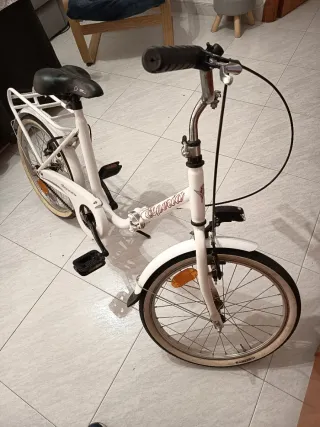 Bicicleta de paseo en color blanco, ideal para niñas. - Cuadro de acero. - Ruedas de 20 pulgadas - Sillín y manillar ajustables. - Portabultos trasero. - Luz delantera - Freno delantero y trasero - 19,5 cms de radio. - Es plegable. Como nueva, no se ha utilizado apenas, pero de estar en la terraza bastante tiempo está un poco sucia y las ruedas desinfladas. No lleva cambio, piñón único.