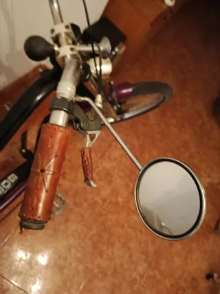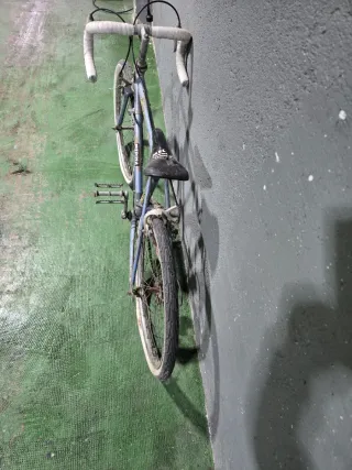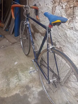 Bici francesa con manillar, ruedas y frenos nuevos, en perfecto estado de uso en general, con bidón, bomba, timbre y luces de dinamo delantera y trasera funcionando, cómodo y elegante sillín Gyes y calapiés con refuerzos de piel. Pintura algo saltada y algo de óxido, pero en general bien conservada. Bolsa de sillín incluida con desmontadores, cámara de repuesto y llave para las tuercas de las ruedas. No se envía, entrega en Santander o razonablemente cerca.