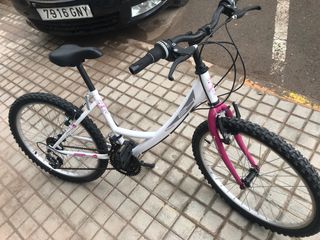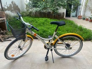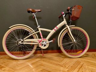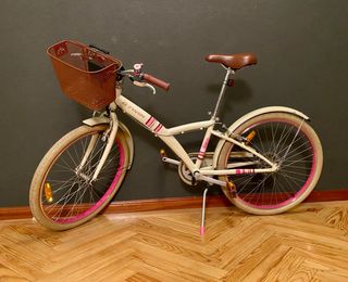 B'Twin Poply 500 de 24 pulgadas, en color crema con detalles en rosa. Tiene 5 marchas en el manillar. Está como nueva, poquísimo uso y siempre guardada dentro de casa. * Diseñada para niños de entre 9 y 12 años aproximadamente, con una altura de 130 a 150 cm. * Incluye una cesta delantera de rejilla marrón y un sillín marrón a juego. * Presenta ruedas con aro rosa y, en ocasiones, pegatinas reflectantes amarillas. * Es un modelo híbrido adecuado para paseos. Entrego en Madrid. No la envío.