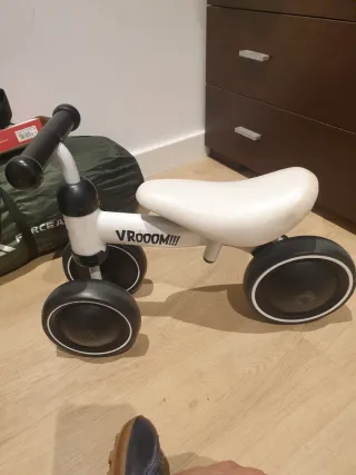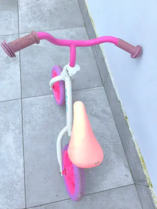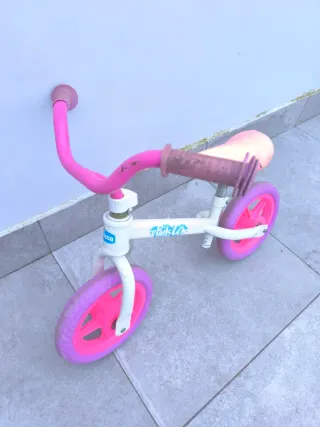 Se regala bicicleta de aprendizaje sin pedales, ideal para los primeros paseos. - Color blanco y rosa. - Ruedas de goma. - Manillar con puños de goma.
