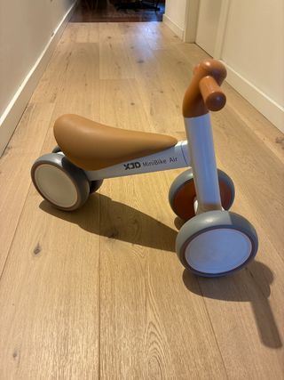 Bicicleta de equilibrio XJD MiniBike Air, ideal para los primeros paseos de los más pequeños. Su diseño ligero y ergonómico facilita el aprendizaje y la diversión. - Color del asiento: marrón. - Color del manillar: marrón. - Ruedas de goma. - Estructura blanca y gris.