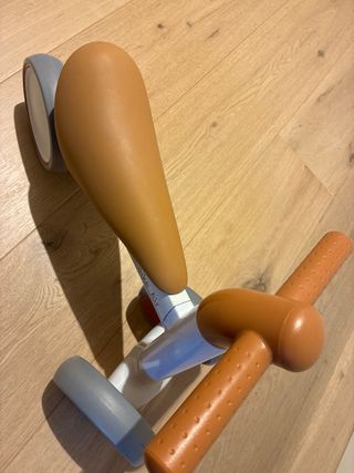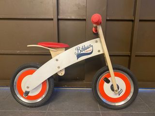 Bicicleta de equilibrio de madera de la marca Janod, modelo Bikloon. Ideal para los primeros paseos. - Estructura de madera blanca. - Asiento rojo. - Ruedas con detalles naranjas y plateados. - Puños rojos en el manillar. Precio original 90€