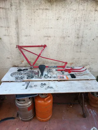 Se vende bicicleta clásica BH en color rojo, ideal para proyecto Incluye: Ruedas con cubiertas, el mantenimiento de los ejes está hecho, habría que pulirlas Cuadro rojo de paseo, falta limpiar y repintar Incluye dos guardabarros por si se desean instalar Las siguientes piezas están todas limpias: Cadena y piñonera, bielas, tija y sillín, pedales, cubre platos, eje de pedalier y rodamientos, eje de dirección y rodamientos, manillar, manetas de cambios y topes de cuadro, puentes de freno, reflector rojo, dirección, dinamo para la dirección, potencia y desviadores, trasero y delantero La mitad del trabajo hecho, falta acabarla y tiempo