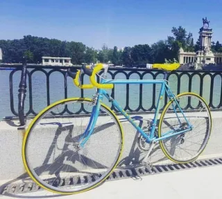Bicicleta clásica de colección Torrot con un llamativo diseño en azul y amarillo. Ideal para paseos y coleccionistas. - Cuadro de bicicleta de carretera. - Manillar y sillín de color amarillo. - Ruedas con aro amarillo. Zona de la Elipa