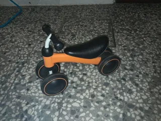 Bicicleta de equilibrio de color naranja y negro, ideal para los primeros paseos de los más pequeños. - Diseño de 4 ruedas para mayor estabilidad. - Asiento acolchado. - Manillar con puños de goma.