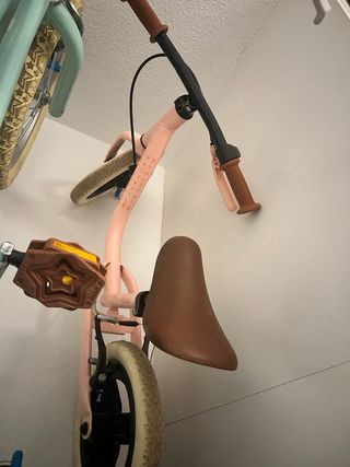 Bicicleta de aprendizaje sin pedales, ideal para los primeros paseos. - Color rosa. - Sillín marrón. - Puños de manillar marrones.