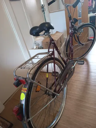 Bicicleta de estilo vintage, de fabricación alemana. Un clásico para disfrutar del paseo. - Color burdeos. - Sillín negro. - Guardabarros. - Portabultos trasero. 28 pulgadas Freno contrapedal y de manillar