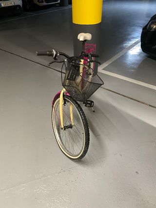 Bicicleta de paseo con un diseño llamativo en color rosa y crema. Cuenta con una cesta delantera para llevar tus pertenencias. - Cesta de malla negra. - Guardabarros delantero y trasero. - Sillín blanco. - Manillar con puños negros, cambio de marchas y timbre. - Cinco piñones y un plato. - De regalo, luces delantera y trasera. - Usada TRES veces