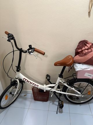 Bicicleta Moma plegable, ideal para desplazamientos urbanos o para llevarla contigo a donde vayas. Su diseño compacto facilita su almacenamiento. - Color blanco. - Manillar y sillín marrones. - Cesta delantera de mimbre. - Ruedas de 20 pulgadas. Se recoge en San Fermín no me desplazo ni hago envíos. El sillín hay que ajustarlo.