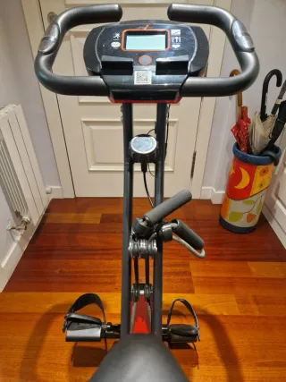 Bicicleta estática de diseño plegable, ideal para mantener la forma en casa. modelo: Bicicleta estática EB100 Domyos - Estructura de color negro. - Asiento ajustable. - Manillar ergonómico. - Plegable y ocupa muy poco - Ruedas para poder moverlo a cualquier habitación - Sillón ergonómico - Varios niveles de resistencia - Aplicación de uso Precio original 250 Usado 3 veces Entrego en mano o facilito entrega No se hacen envíos