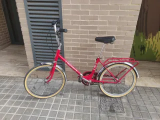 Bicicleta vintage de color azul con ruedas de 20X1 3/8 (un poco más grandes que las plegables modernas). Era de mi madre, de los años 80 la típica BH plegable de la época. Cubiertas, cadena y sistema de frenado nuevo, funciona correctamente para ser una bici clásica. - Manillar con puños rojos. - Sillín negro. - Guardabarros cromados. - Portabultos trasero. - 1 velocidad