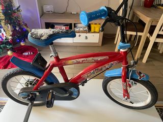 Bicicleta infantil con diseño de la Patrulla Canina. - Color principal rojo con detalles en azul. - Ruedas blancas con radios plateados. - Puños de manillar azules. - Guardabarros delantero y trasero azules.