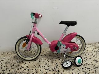 Bicicleta infantil de color rosa, ideal para los más pequeños. Diseñada para aprender a montar. - Ruedines incluidos para mayor estabilidad. - Manillar con puños de goma. - Sillín ajustable en altura. - Diseño con dibujos de unicornios.