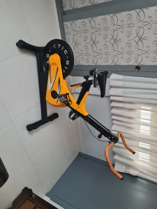 Bicicleta estática GIRO con resistencia magnética. Sillín ajustable. Dispone de dos ruedas para desplazarla. Superestable . - Color naranja y negro. - Estructura robusta. - Manillar ajustable.