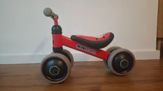 Bici de aprendizaje MINIBIKE en color rojo. - Diseño de 4 ruedas para mayor estabilidad. - Asiento ergonómico. - Manillar con puños de goma. -Altura sillin 22cm -Altura manillar 35cm