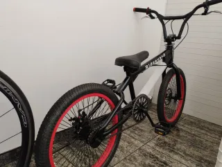 Bicicleta BMX de la marca Ridveyard, con un diseño llamativo en negro y detalles rojos. - Cuadro de color negro. - Llantas de color rojo. - Manillar negro. Con discos de freno, no tiene tija de sillín, lavendo en zona de Alicante, en domicilio, No hago envíos. 20 pulgadas.