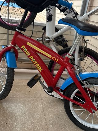 Bicicleta infantil con diseño de Paw Patrol. - Color rojo principal. - Ruedines azules. - Manillar con puños azules. Ruedas 12 pulgadas