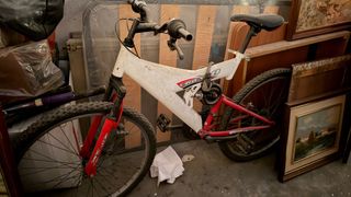 Bicicleta de montaña con un diseño llamativo en blanco y detalles rojos. - Cuadro de bicicleta. - Ruedas de bicicleta. - Manillar de bicicleta.