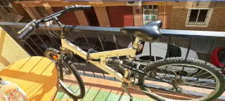 Bicicleta de montaña con suspensión delantera y trasera. El precio no es negociable. - Cuadro de color blanco. - Ruedas todoterreno. - Sillín negro. - Manillar con puños negros.