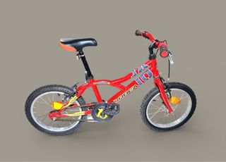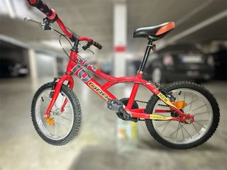 Bicicleta infantil de color rojo, ideal para niños de 4 a 6 años. - B-Pro comprada del corte inglés se ha quedado pequeña. - 16 pulgadas. - Diseño deportivo con detalles coloridos en el cuadro. - Incluye timbre azul en el manillar.