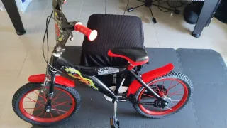 Bicicleta infantil de 16 pulgadas, ideal para los más pequeños. Diseñada para ofrecer diversión y seguridad. - Cuadro de color negro con detalles en rojo. - Ruedas de 16 pulgadas con llantas rojas. - Guardabarros delantero y trasero en color rojo. - Puños de manillar rojos.