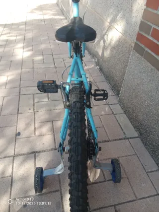 Bicicleta infantil de color azul, en perfecto estado y con muy poco uso. - Sillín marrón. - Ruedas con llantas amarillas. - Manillar cromado.