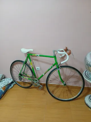 Bicicleta de carretera clásica de la marca Raleigh. Un modelo icónico para los amantes del ciclismo. - Cuadro de color dorado. - Manillar curvo con cinta roja. - Ruedas con llantas plateadas y neumáticos negros con banda roja. Precio algo negociable