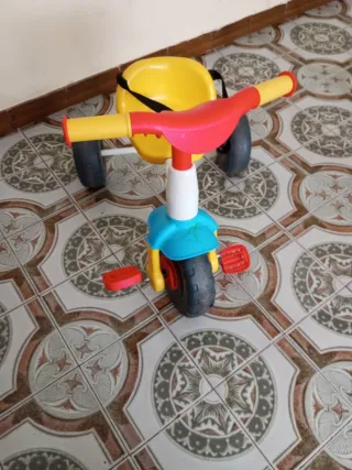 Triciclo infantil con asiento amarillo y detalles en rojo y azul. - Ruedas negras. - Pedales rojos. - Manillar amarillo con empuñaduras rojas.