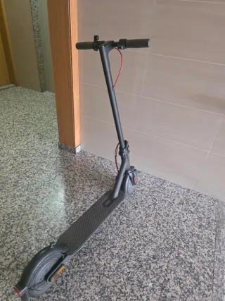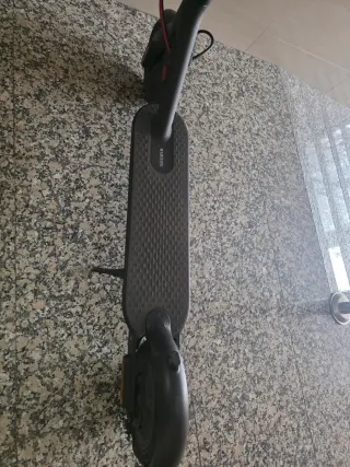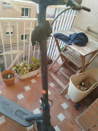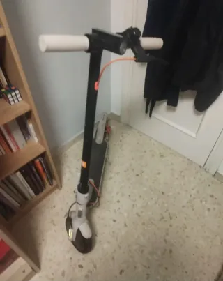 Patinete eléctrico Xiaomi en buen estado. - Manillar con puños blancos. - Cable naranja visible. - Rueda delantera con reflectante.