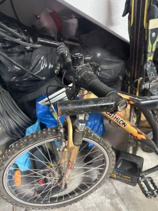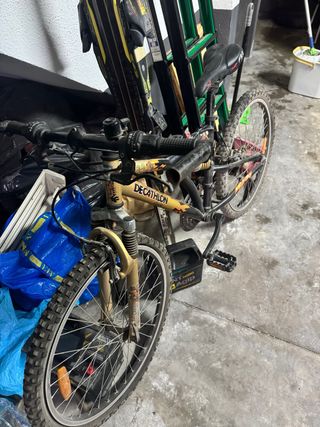 Bicicleta de montaña Decathlon con 10 años de antigüedad. - Cuadro de color dorado y negro. - Ruedas con llantas de radios. - Sillín negro con detalles rojos. - Manillar con puños negros.